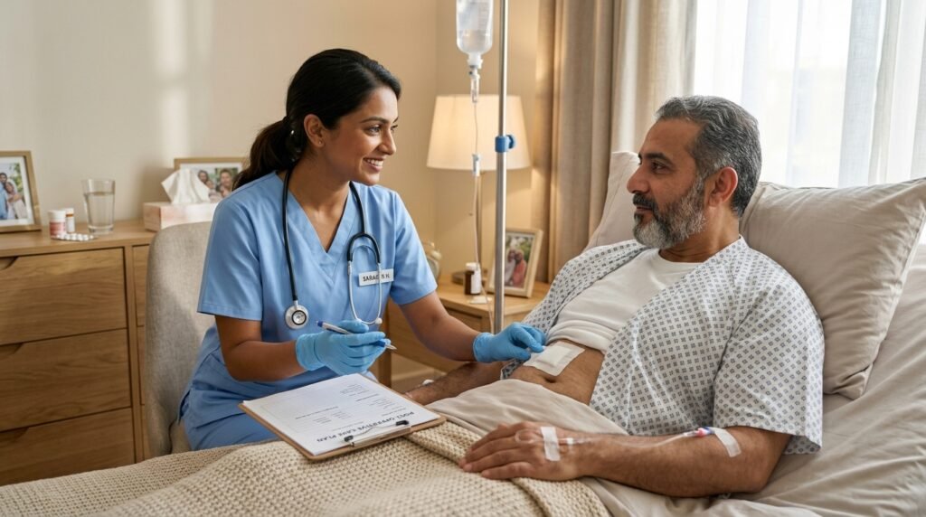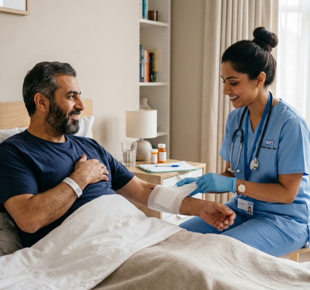 Professional home support for safe recovery, wound care, medication monitoring, and patient comfort.